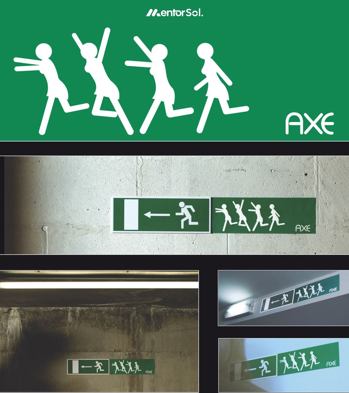 Ax, a brand known for its fragrances, replaced some exit signs with an image of a man running away from women. The idea was to play on the concept that women were chasing him due to his irresistible fragrance.